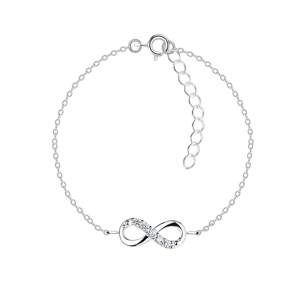 Tämä kaunis hopeinen rannekoru keskipisteenä on herkkä Infinity-symboli, joka kuvastaa ikuista ystävyyttä tai rakkautta. Symboli on kiinteä osa siroa ketjua, ja se on osin koristeltu säihkyvillä, kirkkailla zirkonia-korukivillä, jotka tuovat koruun juhlavaa hehkua.