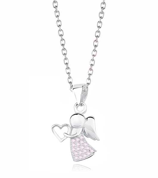Hopeinen kastekoru enkeli. Tässä suloisessa kasteriipuksessa esiintyy enkeli, joka pitelee sydäntä. Enkeli on koristeltu vaaleanpunaisilla zirkoneilla. Erinomainen kaste- tai nimiäislahja! Riipuksen koko on 14 x 22 mm ja kaulakorun ketjun pituus on lapsille sopiva 38 cm. Valmistusmateriaali on laadukas nikkelitön 925 sterling hopea. Siro hopeariipus on ihana lahja lapselle!
